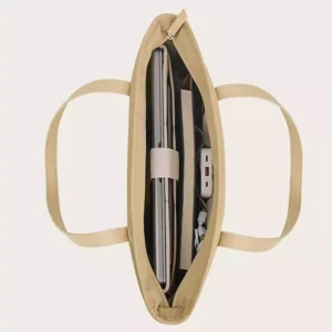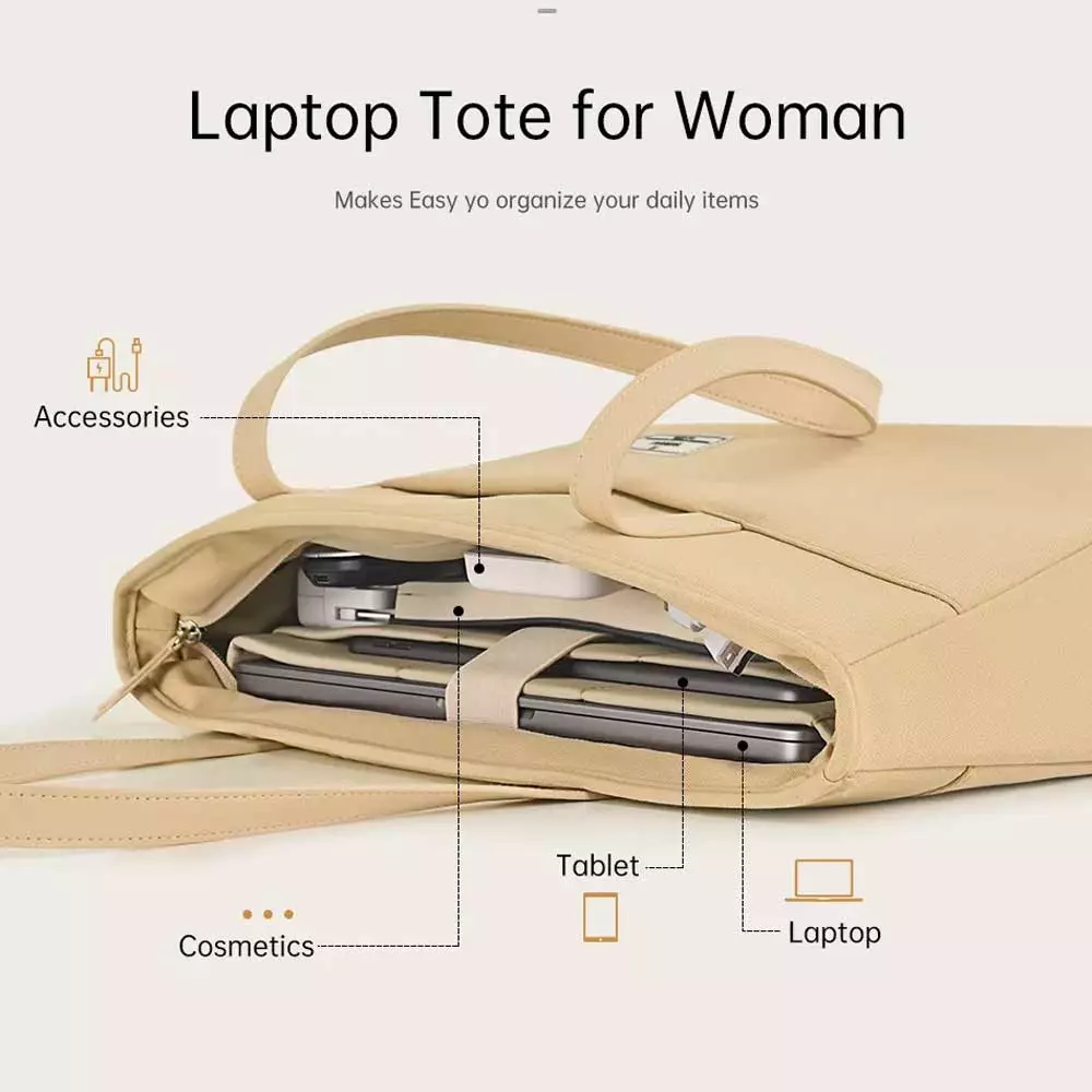 - Ora tote for women size is 14inch and 16 inch. Large capacity for most laptops.That have a velcro fastener to secure the computer.The shopping bag has different pockets to meet your different needs.You can easily position your laptop, iPad, accessories, cards and wallet in the right position.